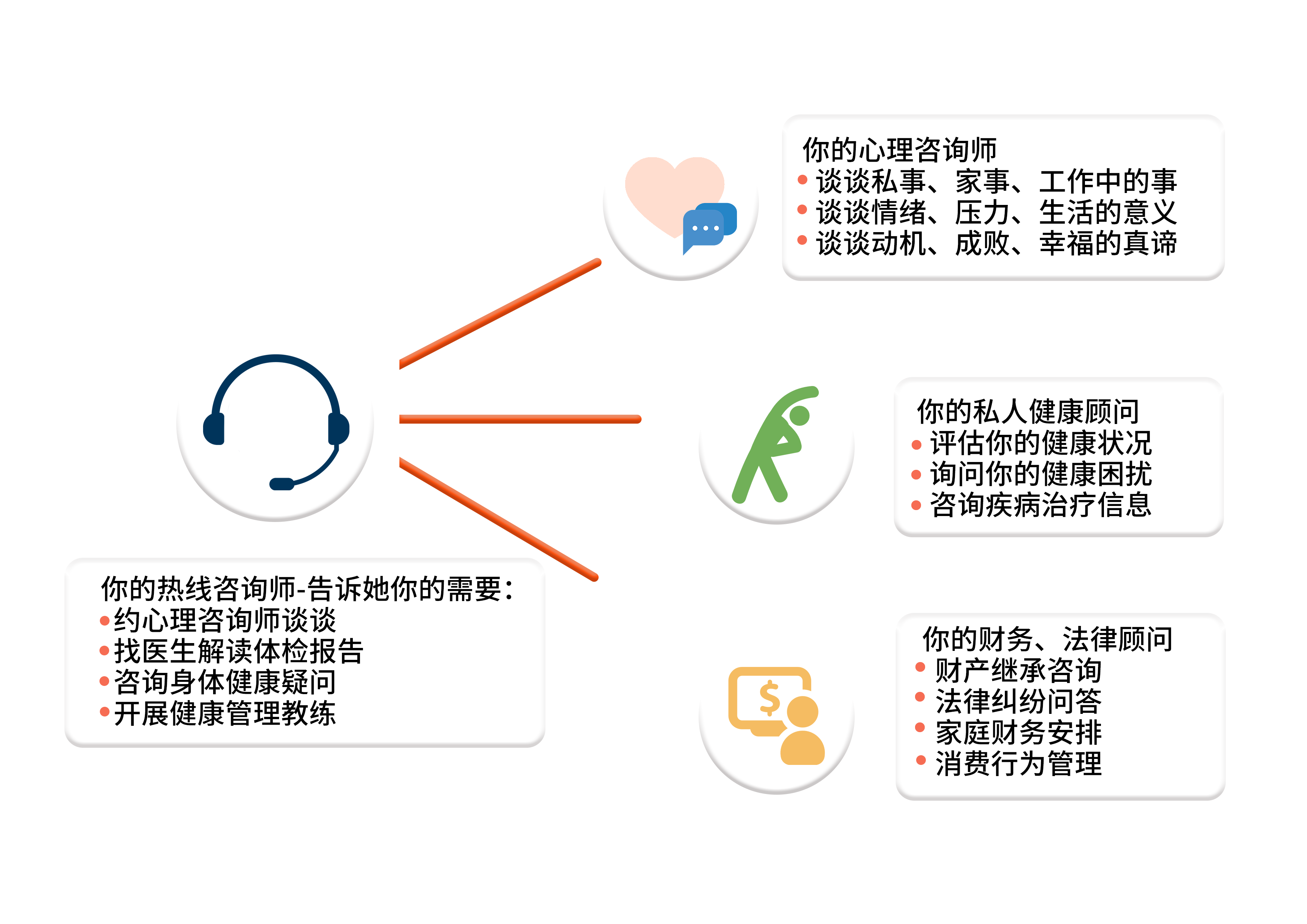 7×24全人健康热线,不仅可以帮助员工疏导心理压力,更可以解答员工的健康问题,财务问题和法律问题。热线系统由硕士水平的咨询师接听,员工可以随时拨打,充分体会到这一服务平台的专业性和即时性。一对一咨询服务包括电话咨询、面谈咨询和网络咨询。